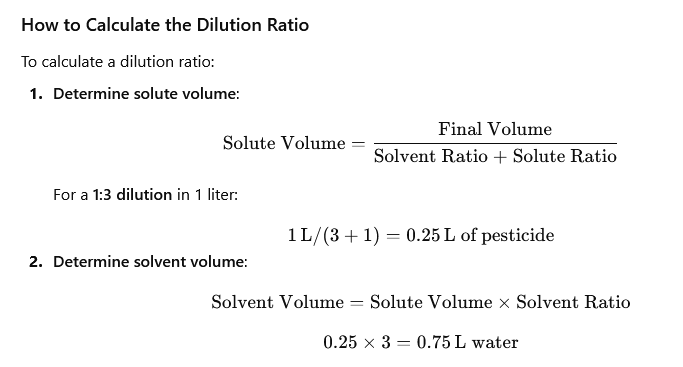The dilution ratio is the proportion of solute (pesticide concentrate) to solvent (water). For example, a 1:3 dilution ratio means 1 unit of pesticide is mixed with 3 units of water, giving a total of 4 units of solution. This ratio is essential for precise pesticide application rate calculations.